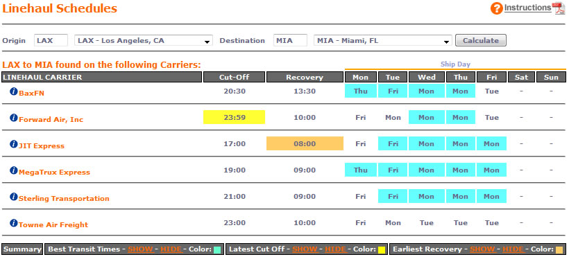 The FAST LH tool allows you to quickly run a search to see the transit schedules of up to 5 linehaul carriers on any given lane.
