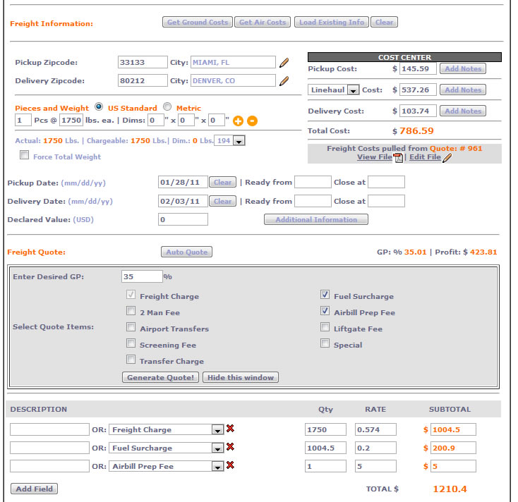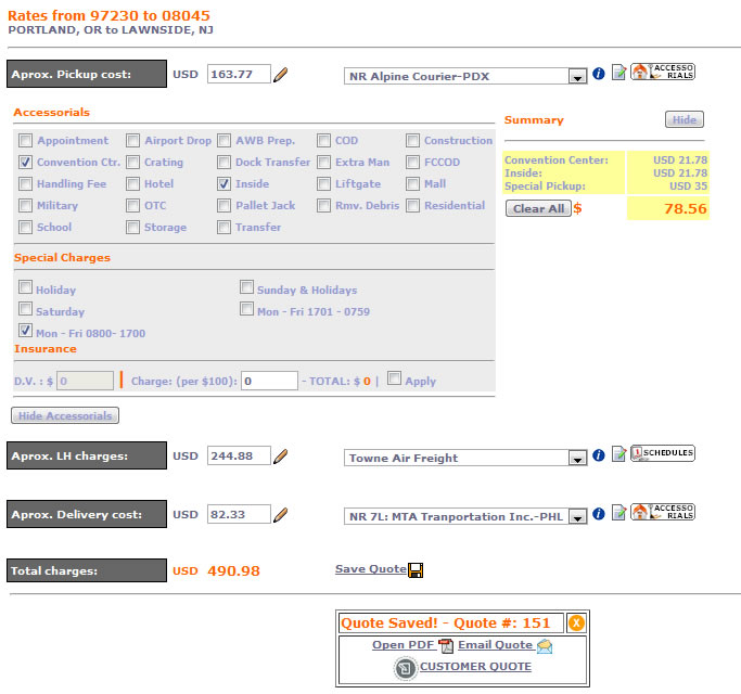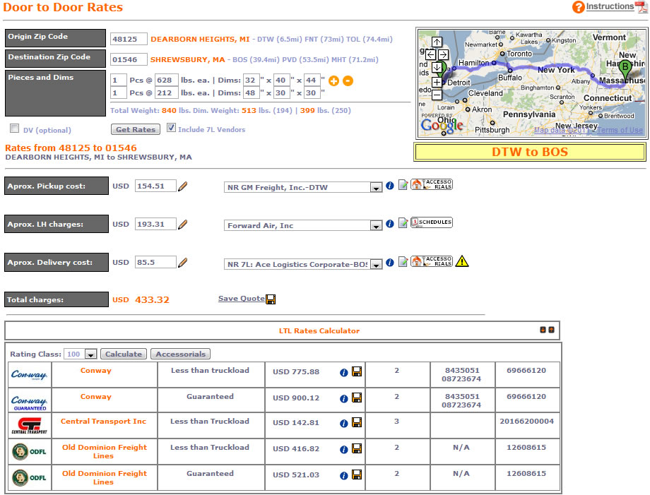 Utilizing the most current technologies you are able to instantly retrieve your rates from your LTL carriers. We'll return their rates along with quote number and transit time.